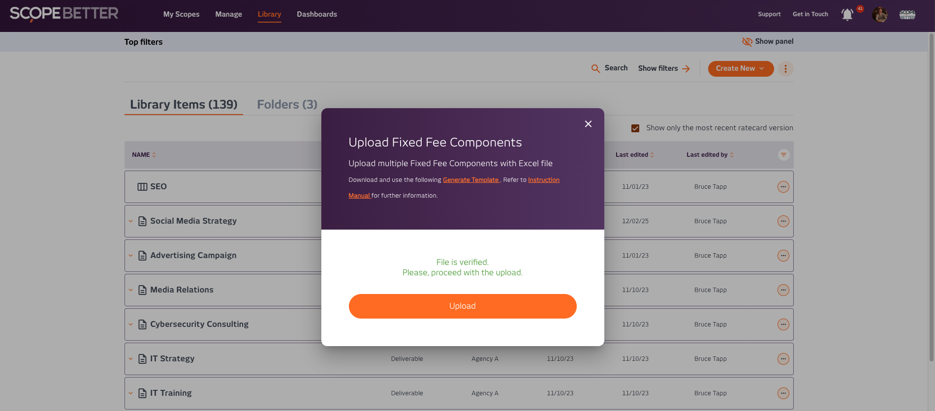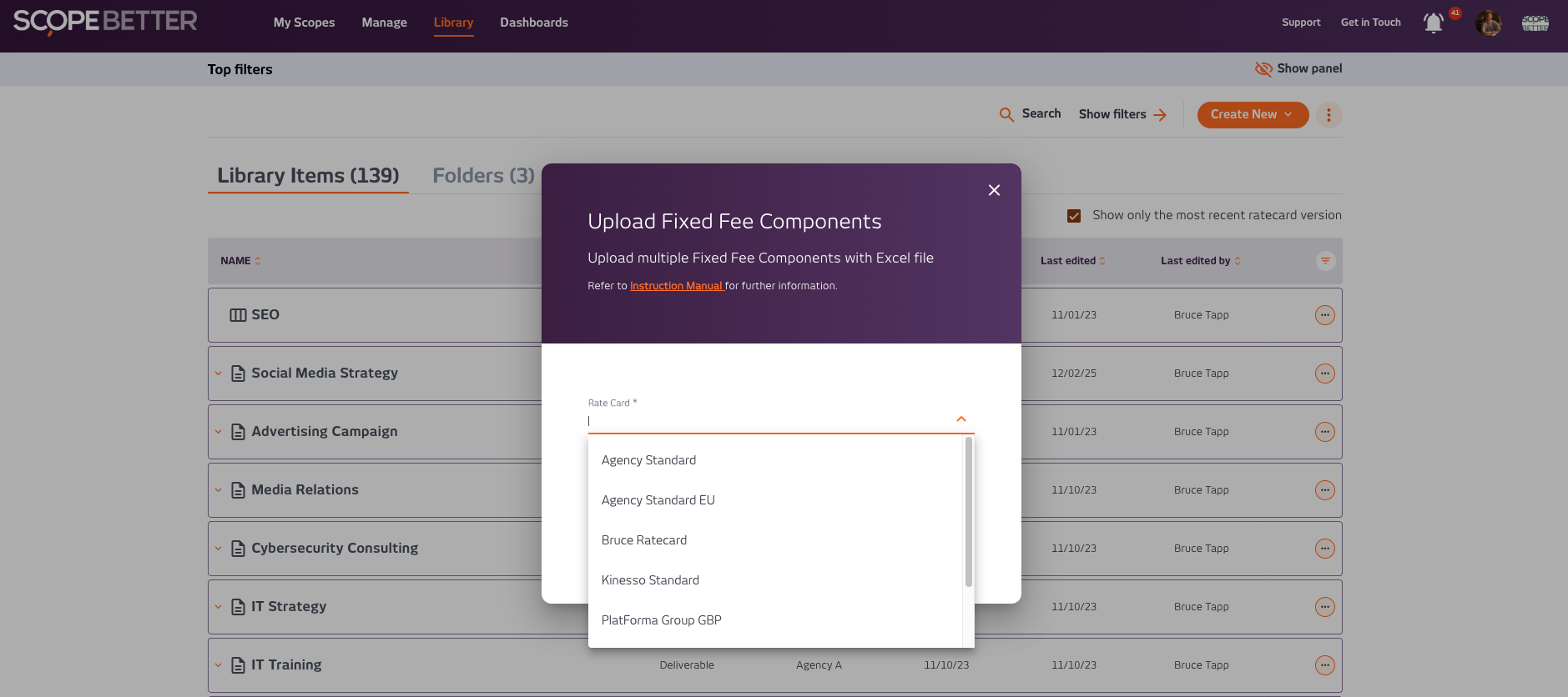 This guide will explain how to upload Fixed Fee Components. In the ScopeBetter platform there are two ways to upload Fixed Fee components. Components can be uploaded into the Library individually or in bulk via our excel uploader.
